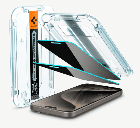Spigen EZ Fit Privacy zaštitno staklo za iPhone 15 Pro. Opremljen inovativnom maskicom dizajniranom da eliminira izgubljeno vrijeme u postizanju savršenog poravnanja. Jednostavno postavite maskicu na telefon, pritisnite središte i gledajte kako staklo sjeda na mjesto.