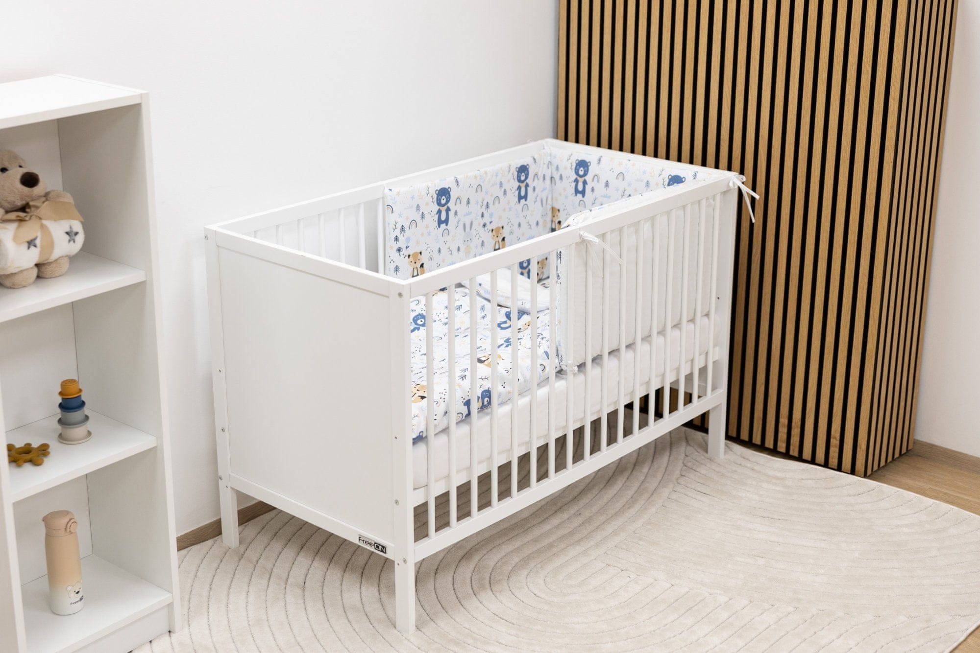 Središnji dio seta je dječji krevetić FreeON Lina dimenzija 120 × 60 cm, koji omogućuje podešavanje visine podnice na tri različite razine. Priloženi madrac i tekstilni komplet osiguravaju trenutnu spremnost kreveta za korištenje.