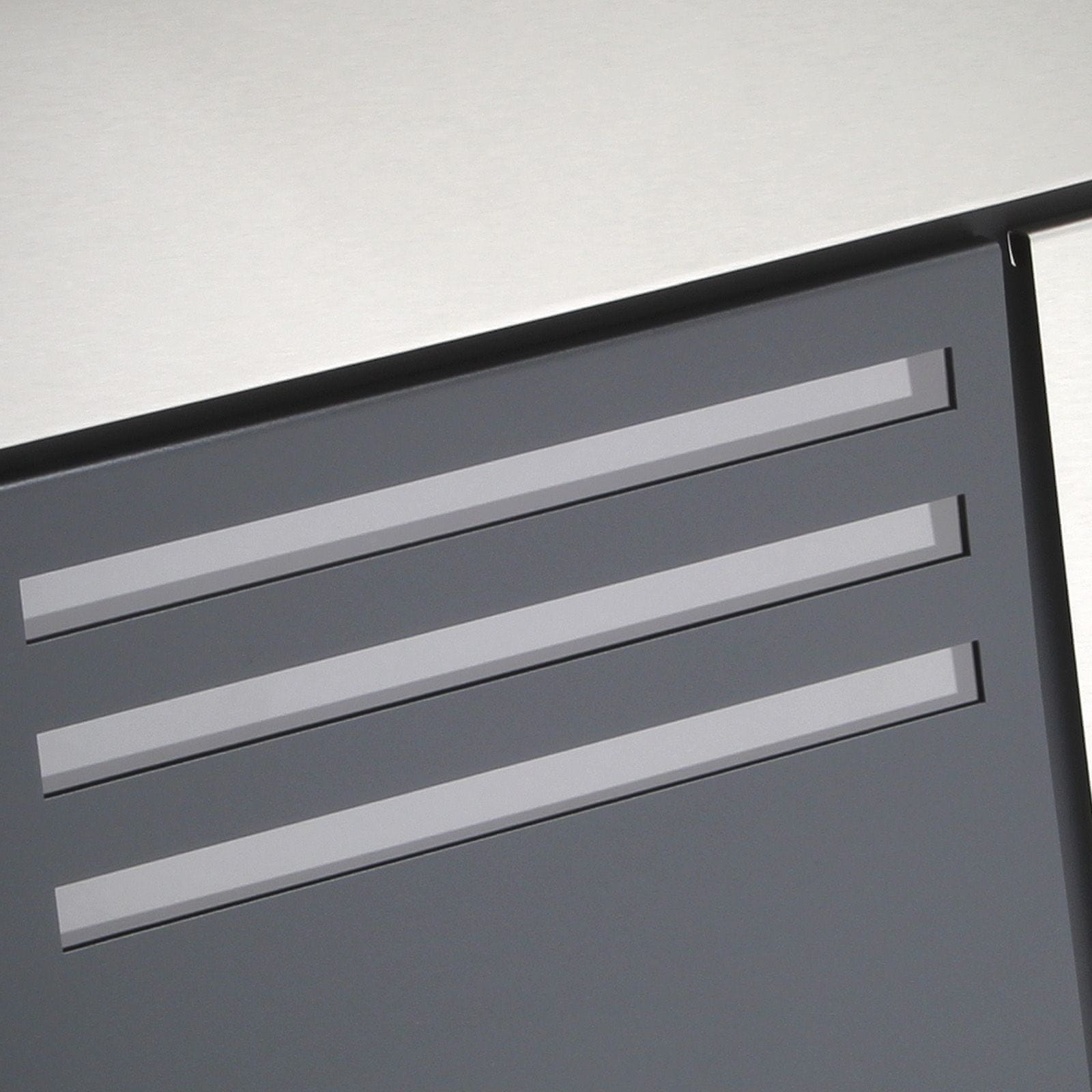 Dizajnerska kutija od pocinčanog antracitnog čelika s poklopcem od nehrđajućeg čelika. Uključen je i materijal za ugradnju.Na dnu se nalazi i ladica za novine.Dimenzije 370 × 370 × 105 mm