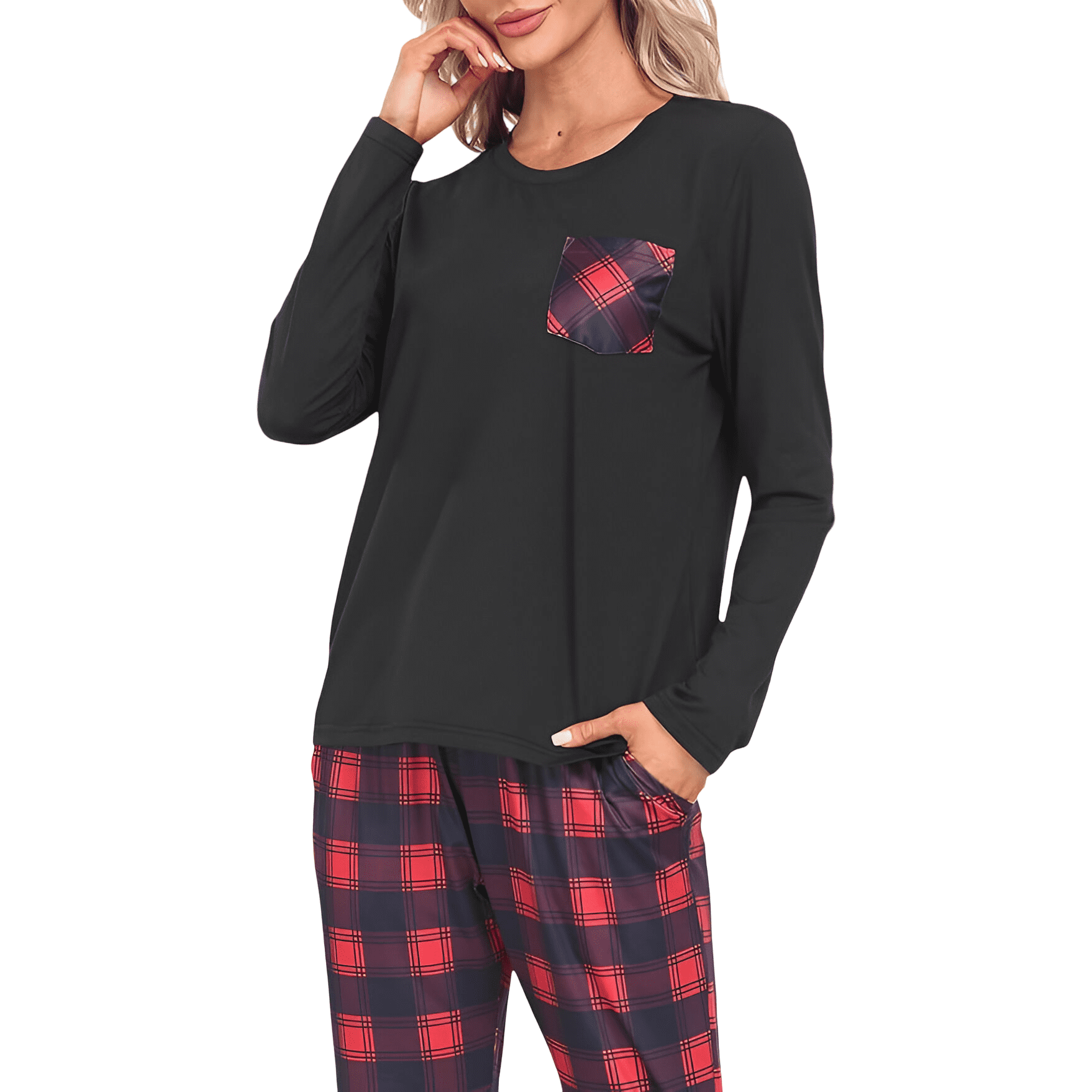 Ženska dvodijelna pidžama predstavlja praktičan izbor za hladnije zimske i jesenske večeri. Ovaj komplet izrađen je od pažljivo odabrane mješavine materijala koja osigurava mekoću i potrebnu slobodu kretanja tijekom odmora. Tkanina je prozračna i nježna prema koži, što ovaj set čini prikladnim za spavanje ili boravak kod kuće. Gornji dio dizajniran je s klasičnim okruglim izrezom i sadrži estetski karirani džep koji se slaže s uzorkom na donjem dijelu. Donji dio kompleta opremljen je podesivim strukom koji omogućuje individualno prilagođavanje te dvama praktičnim džepovima za odlaganje sitnica. Intenzivna crna boja i tradicionalni karirani uzorak pružaju kompletu elegantan i skladan izgled, čineći ga funkcionalnim komadom odjeće za svakodnevnu upotrebu u kućnom okruženju.