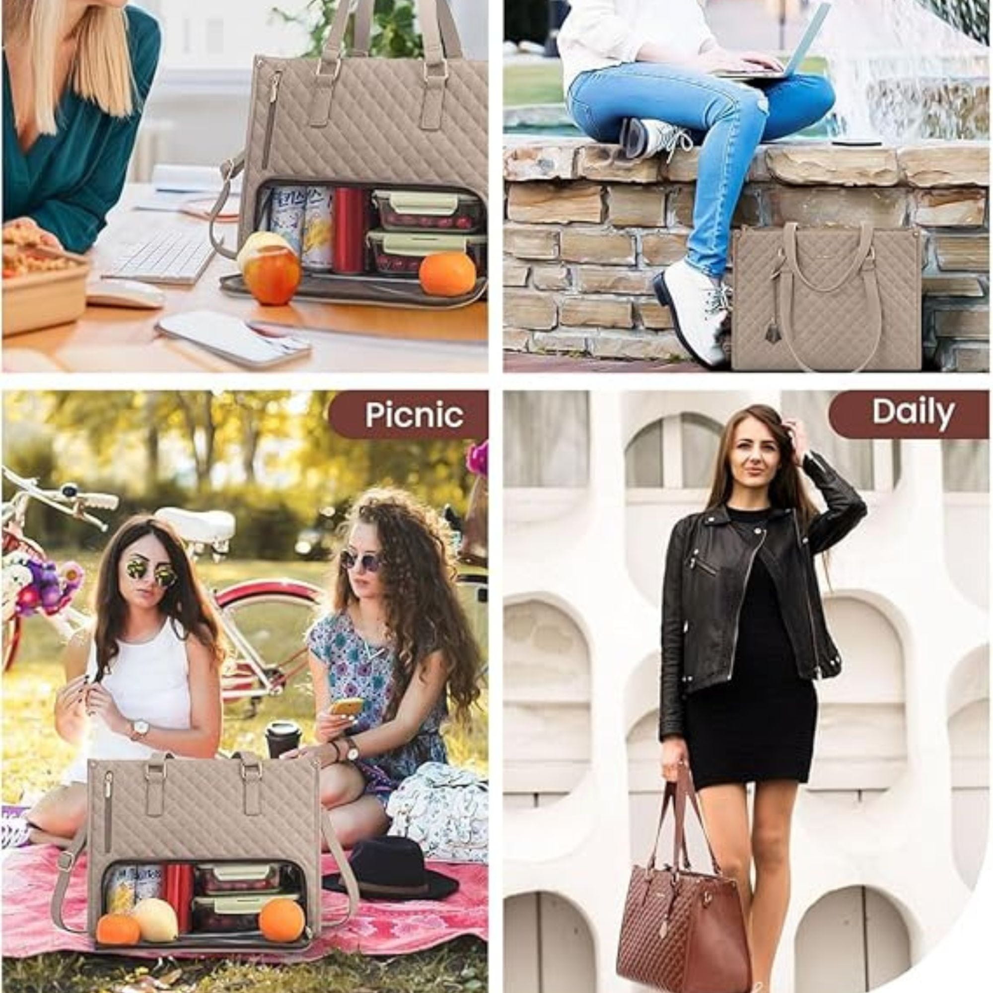 Prošivena torba za ručak s prostorom za laptop čuva tople obroke 5 h, hladne 10 h. Prostrana i organizirana, s odjeljcima za laptop, punjač i ručak. U paketu i stilski novčanik. Idealna za posao, školu i putovanja.