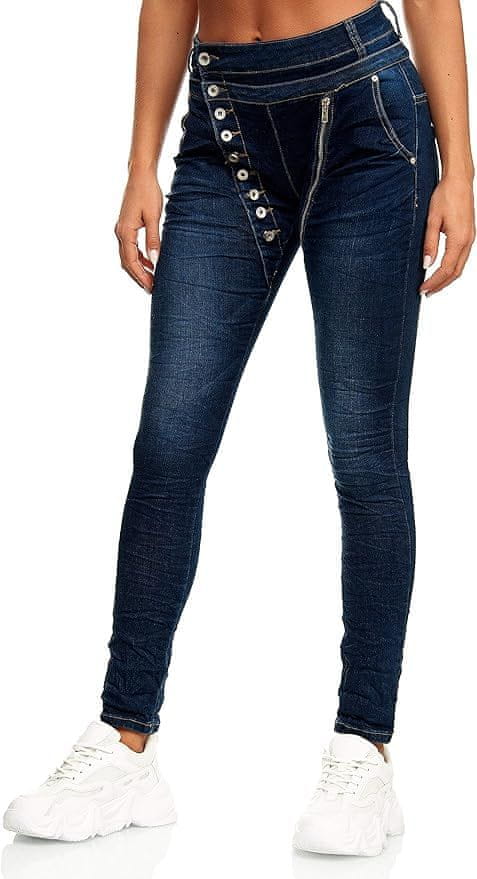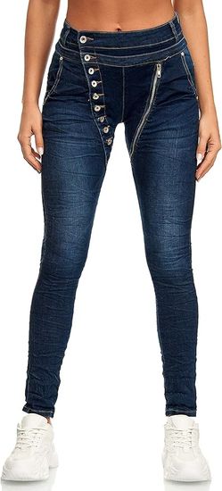 Nikcorp Elara ženske traperice Slim Fit Boyfriend kroj, visoki struk s kosim gumbima i lančićem, tamnoplave 48 (4XL)