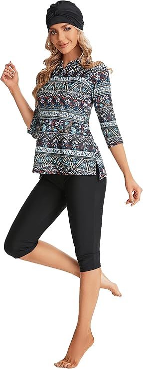 - Dizajn: Uzorkovani kupaći kostim s rukavom 3/4 i potpunom pokrivenošću.