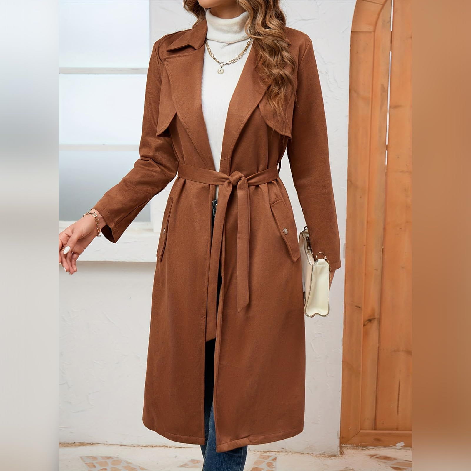 Nikcorp Dugi ženski kaput od brušene kože s pojasom za jesen i zimu, boja kave, veličina XXL