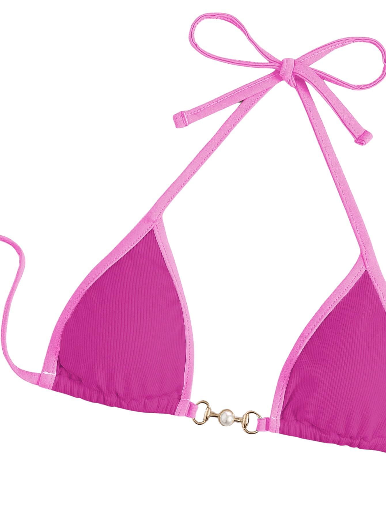 Nikcorp Ženski dvodijelni kupaći kostim bikini brazilski s biserima i ukrasnim prstenovima, trokutasti kroj, intenzivno ružičasta, XS