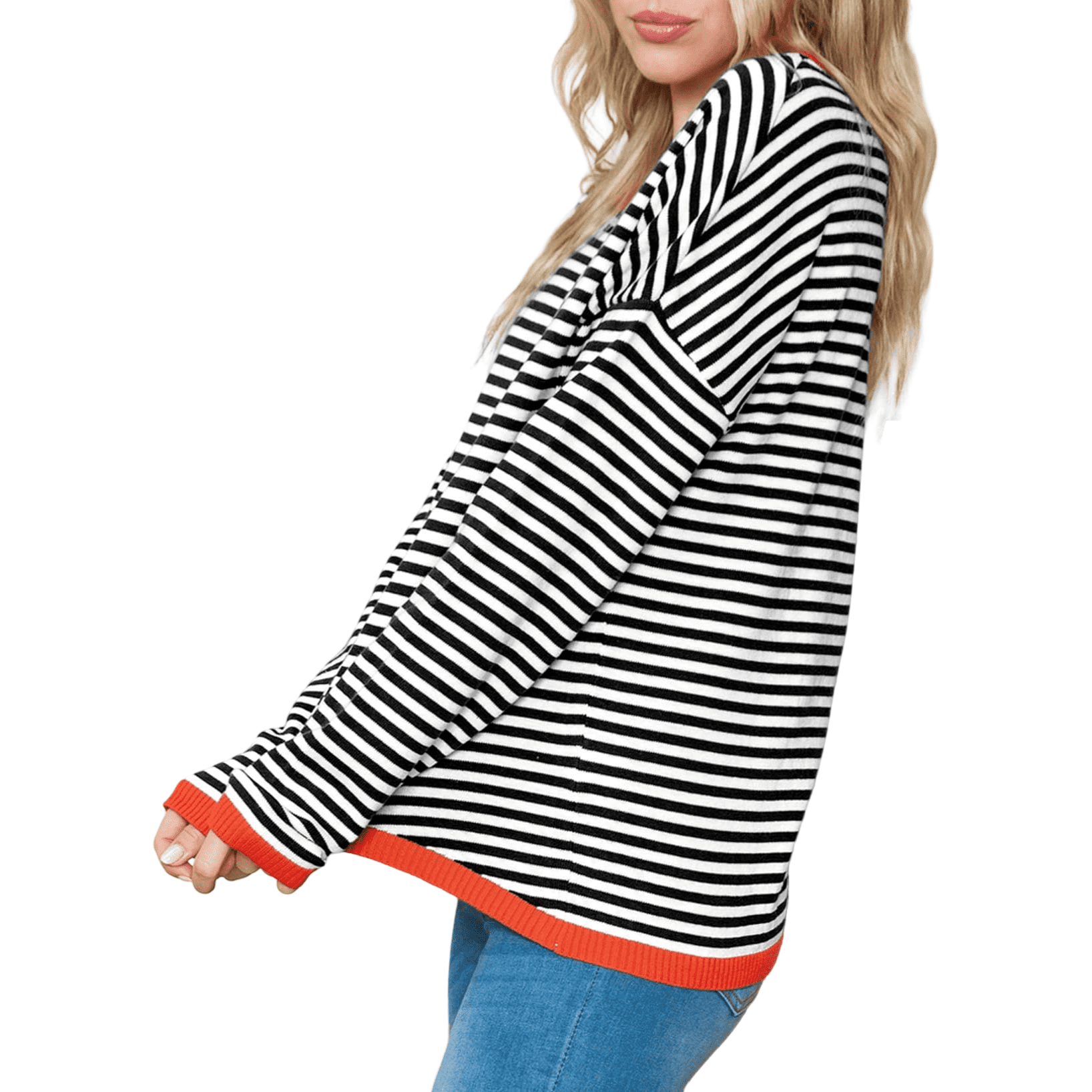 Nikcorp Ženski prugasti džemper od 100% pamuka, okrugli izrez, topli mekani pleteni pulover, crno-bijeli, veličina M