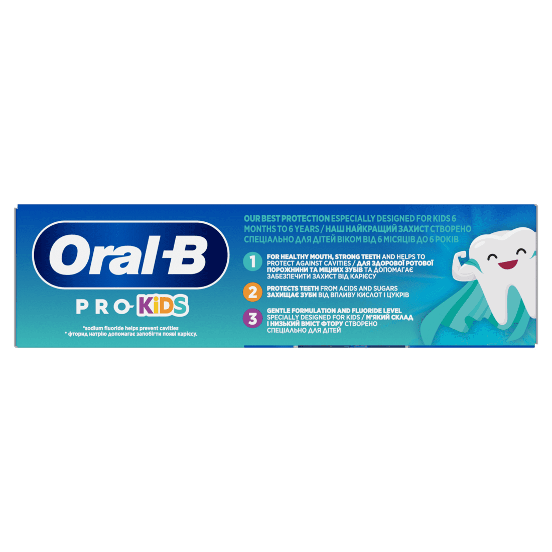 Oral-B Pro Kids pasta za zube posebno je dizajnirana za djecu od 6 mjeseci do 6 godina i razvijena je u suradnji sa stomatolozima. Sadrži količinu fluora primjerenu dobi koja pomaže u jačanju cakline i štiti zube od karijesa i štetnog djelovanja kiselina i šećera. Zahvaljujući blagom okusu mente, pranje zubi bit će ugodno, a ujedno zajamčena svakodnevna oralna higijena vašeg djeteta.