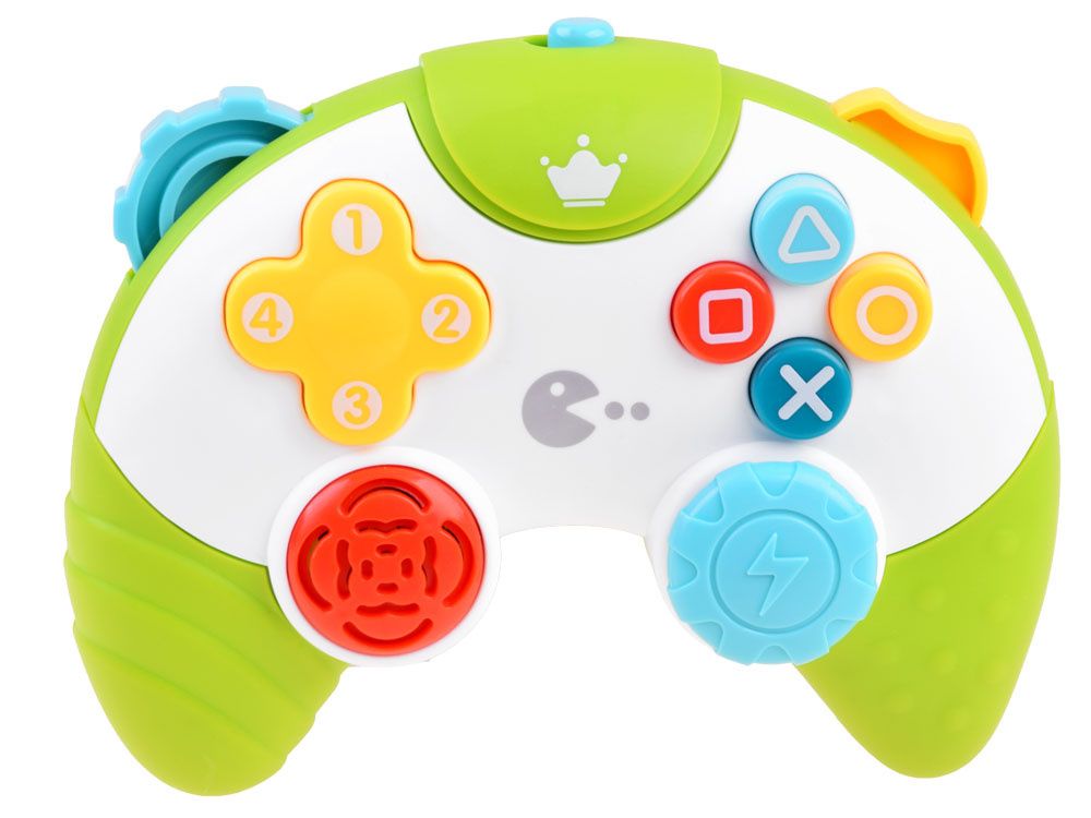 Glazbeni igraći kontroler je igračka namijenjena maloj djeci koja žele prijeći ne samo na daljinski upravljač, telefon, već i na igraći kontroler. Nije previše poznata činjenica da djeca pažljivo promatraju svoje roditelje i rado ih oponašaju. Zato nudimo ovaj senzacionalni šareni upravljač koji će zasigurno privući pažnju svakog mališana i pomoći ga spasiti od svađe sa starijim bratom ili sestrom :) Upravljač će biti idealan za roditelje i stariju braću i sestre koji znaju da ne vole biti ometani. Samo pritisnite prekidač smješten na vrhu i vaše dijete se može igrati. Položaj gumba odgovara stvarnoj konzoli, tako da igračka izgleda realističnije. Ispod svakog gumba skrivaju se zvukovi, melodije i trepćuće svjetlo. Najveći gumb na konzoli omogućuje stvaranje vlastitih pjesama, što je izvrsno za razvoj mašte i glazbenog talenta vašeg djeteta. Na stranama upravljača nalaze se elementi koji pri kretanju ispuštaju zveckajući zvuk. Upravljač je vrlo lijepo i impresivno izrađen, veličinom prilagođen malim dječjim rukama.